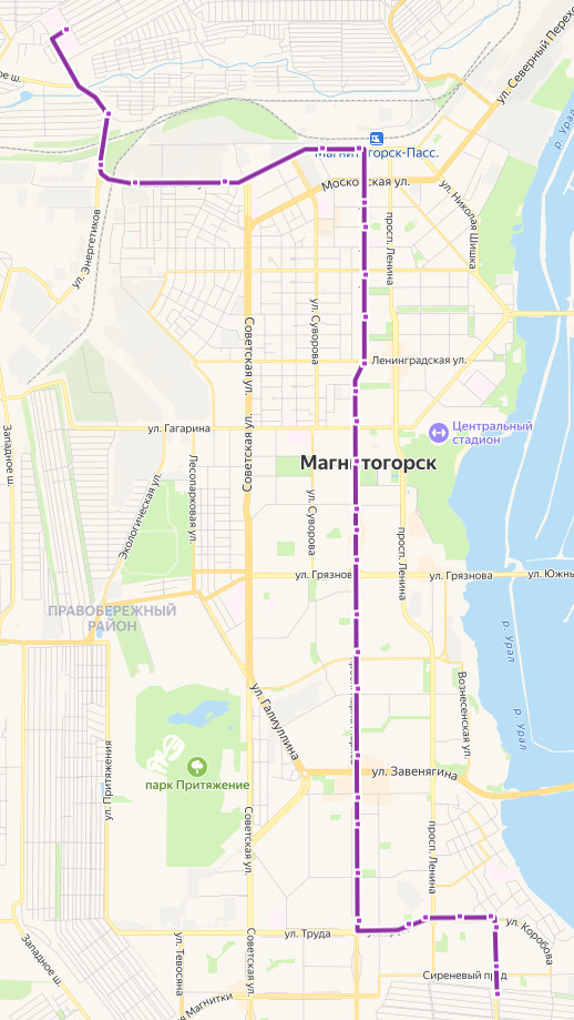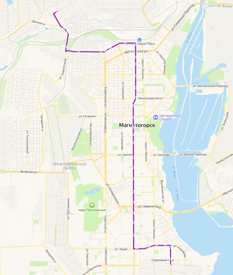 СНТ МЕТИЗНИК → Ресторан Руслан → СНТ Строитель-2 → АЗС Шурави → Хладокомбинат → Хлебокомбинат 2 → Зеленый рынок → Депо-2 → ул. Чекалина → Привокзальная площадь → Первомайская улица → Уральская улица → Комсомольская улица → Общежитие МГТУ → проспект Маркса, д.55 → Центральный рынок → ул. Гагарина → ул. Правды → ул. Дружбы → Универмаг → Кинотеатр Современник → проспект Маркса, д. 115 → ул. Советской Армии → ул. Сталеваров → ул. Завенягина → Семейный парк → Энгельса → ул. Ручьева → Владислава Романова → Школа Ромазана → Станичная → Магуз → ул. Калмыкова → Сиреневый проезд → ул. КАЛМЫКОВА, д. 16