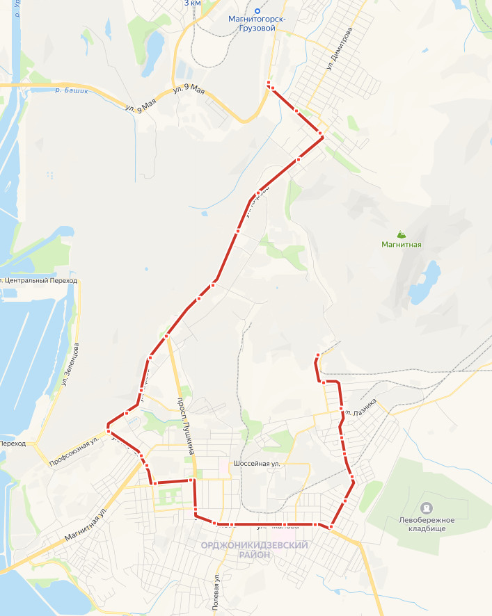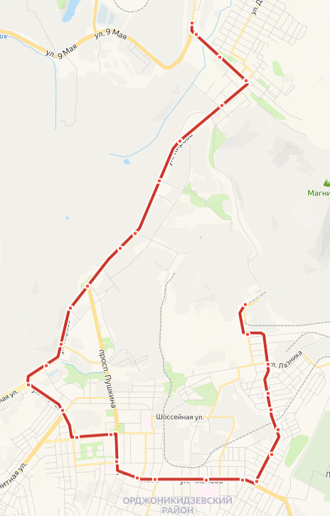ТОВАРНАЯ → Башик → пос. Димитрова → пос. Березки → пос. Брусковый → Прокатмонтаж → Автошкола → ул. Луговая → Автобаза → пл. Комсомольская → ул. Кирова, д.70 → Электросеть → ул. Кирова → Треугольник Профсоюзной → ул. Магнитная → ул. Маяковского → пл. Победы → ул. Чайковского → ул. Фрунзе → ул. Полевая → Горбольница 1 → ул. Островского → ул. 9 Января → ул. 8 Марта → ул. Хабаровская → ул. Кузбасская → ул. Черняховского → Ресторан Спутник → ЗБИ Дом → РИС