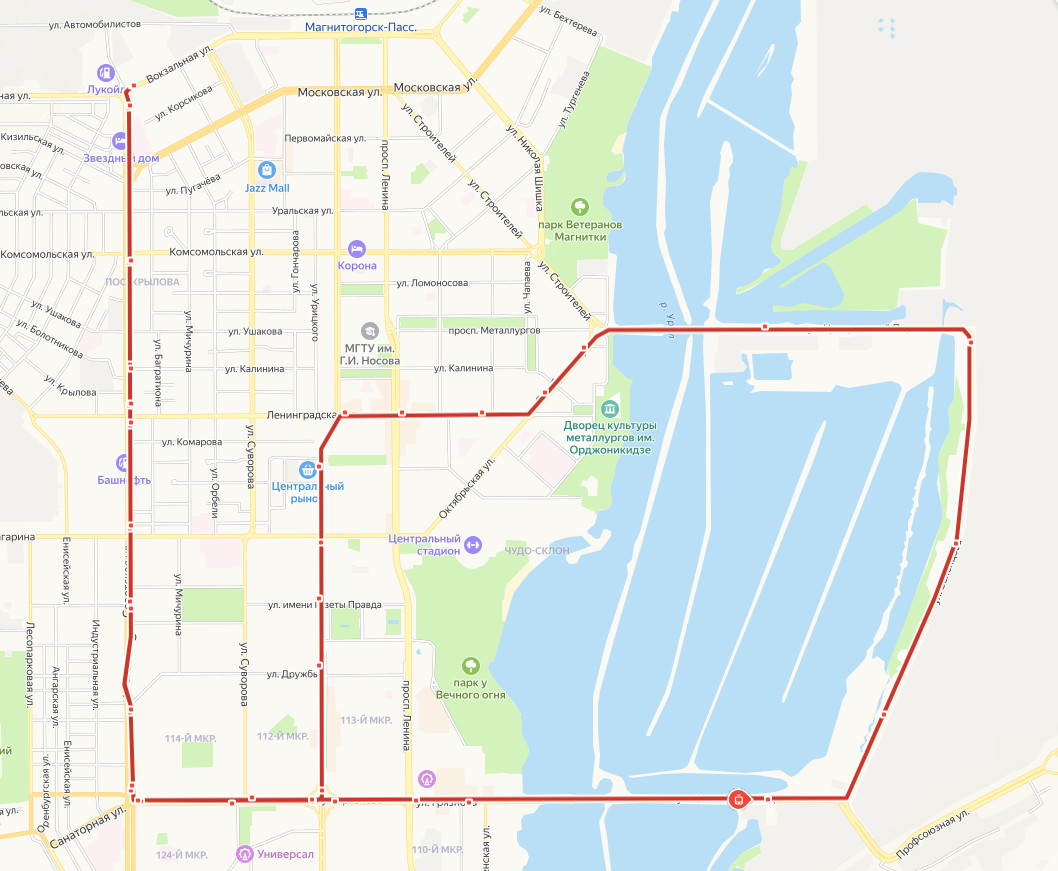 ЗЕЛЕНЫЙ РЫНОК → Хирурга Бурденко → ул. Тимирязева → ул. Калинина → Таможня → ул. Комарова → Трест Магнитострой → ул. Правды → Школа Агапитова → ул. Грязнова → ул. Грязнова, д.4 → Консерватория → ул. Грязнова, д.37 → пл. Мира → Цирк → Южный переход → ТЭЦ → Береговая → БРОНЕВАЯ → Металлургов → Центральный переход → площадь Носова → ул. Чапаева → ул. Куйбышева → проспект Ленина → проспект Карла Маркса, д.55 → Центральный рынок → ул. Гагарина → Куранты → ул. Дружбы → Юность → ул. Грязнова, д.37 → Консерватория → ул. Грязнова, д.4 → ул. Грязнова → Школа Агапитова → ул. Правды → Трест Магнитострой → ул. Комарова → Таможня → ул. Калинина → ул. Тимирязева → Хирурга Бурденко → ЗЕЛЕНЫЙ РЫНОК