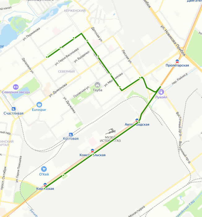ул. ДРУЖАЕВА → Детская поликлиника 5 → ул. Львовская → ул. Героя Васильева → ул. Газовская → пр-т Бусыгина → ул. Переходникова → Метро Автозаводская → Метро Комсомольская → Главная проходная → МЕТРО КИРОВСКАЯ
