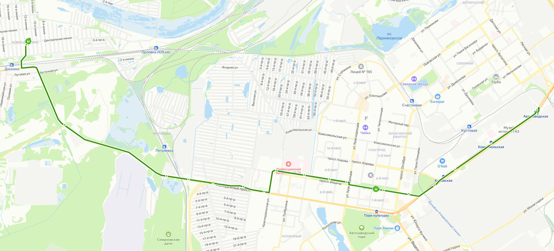 НОВОЕ ДОСКИНО, ул. 13 линия → Новое Доскино, ул. Восточная → поворот на ГСХП Доскино → Сады Авиатор → АЗС → Сады Надежда → Трамвайное депо 3 → 52 квартал → 43 квартал → 35 квартал → ул. Краснодонцев → Администрация Автозаводского района → ул. Лоскутова → пр-т Ильича → Метро Кировская → Главная проходная → Метро Комсомольская → МЕТРО АВТОЗАВОДСКАЯ