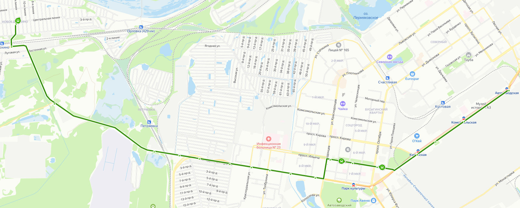 МЕТРО АВТОЗАВОДСКАЯ → Метро Автозаводская → Метро Комсомольская → Главная проходная → Метро Кировская → проспект Ильича → ул. Лоскутова → Администрация Автозаводского района → бульвар Виктора Коноваленко → Школа 144 → Больница 23 → 52 квартал → Трамвайное депо 3 → Сады Надежда → АЗС → Сады Авиатор → поворот на ГСХП Доскино → НОВОЕ ДОСКИНО, ул. 13 линия