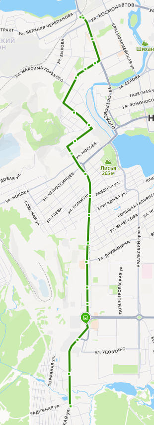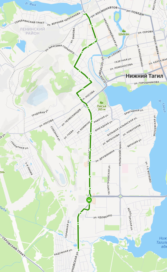ул. ВОГУЛЬСКАЯ → Кинотеатр Урал → ДК Юбилейный → Рудоуправление → Магазин Строитель → Школа 23 → пер. Промышленный → Дом молодежи → ул. Кирова → Тагилэнерго → Магазин Глобус → Магазин 5 → У камня → Школа 90 → Гальянский рынок → Универсам → Карьер → УПТК → ул. Проселочная → ГОРБУНОВО, ул. Малая Кооперативная
