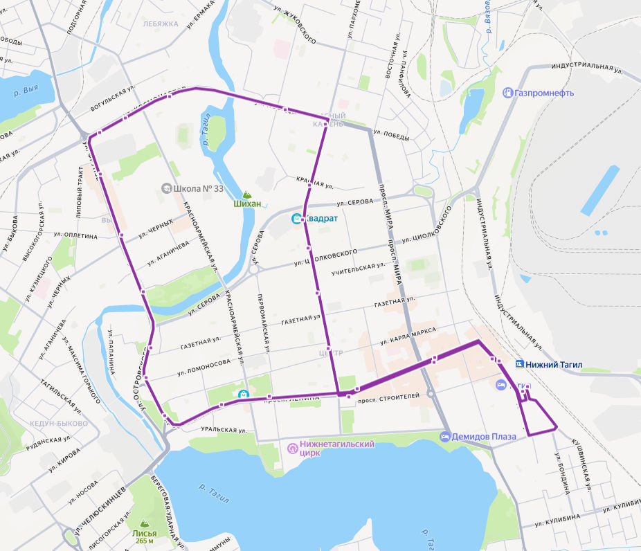 ЖЕЛЕЗНОДОРОЖНЫЙ ВОКЗАЛ → Железнодорожный вокзал → пр-т Ленина → Драматический театр → Кинотеатр Современник → ул. Огаркова → Музей → ул. Островского → Новокомсомольская → ТЦ Мегамарт → Рудоуправление → ДК Юбилейный → Кинотеатр Урал → ул. Красноармейская → Выя → мкр. Приречный → Кинотеатр Красногвардеец → ул. Красная → ТЦ Квадрат → Дворец молодежи → Магазин Магнит → Горно-металлургический колледж → Драматический театр → проспект Ленина → Магазин Алиас → ЖЕЛЕЗНОДОРОЖНЫЙ ВОКЗАЛ