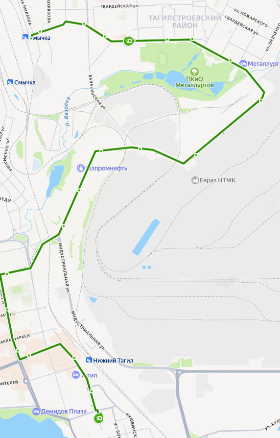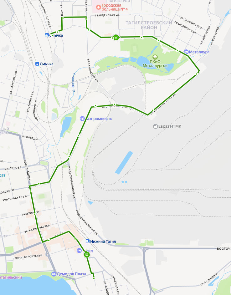 ТЦ РАЙТ → Кулинарное училище → Железнодорожный вокзал → пр-т Ленина → пр-т Мира → Рынок → ул. Циолковского → АТП-6 → Управление механизации → Монтажников → ЖБИ → Управление НТМК → Комсомольская → Дворец культуры НТМК → Кинотеатр Сталь → Парк культуры → ул. Металлургов → ТЦ Тагилстроевский → Детская городская поликлиника 4 → по требованию → СТАНЦИЯ СМЫЧКА