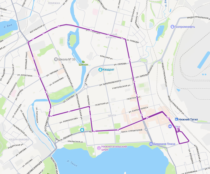 ЖЕЛЕЗНОДОРОЖНЫЙ ВОКЗАЛ → Железнодорожный вокзал → пр-т Ленина → пр-т Мира → Рынок → ул. Циолковского → Строительный техникум → ул. Восточная → Кинотеатр Красногвардеец → мкр. Приречный → Выя → ул. Красноармейская → Кинотеатр Урал → ДК Юбилейный → Рудоуправление → ТЦ Мегамарт → Новокомсомольская → Магазин Стрела → Росинка → Центр занятости → МИЗ → Кинотеатр Современник → Драматический театр → проспект Ленина → Магазин Алиас → ЖЕЛЕЗНОДОРОЖНЫЙ ВОКЗАЛ