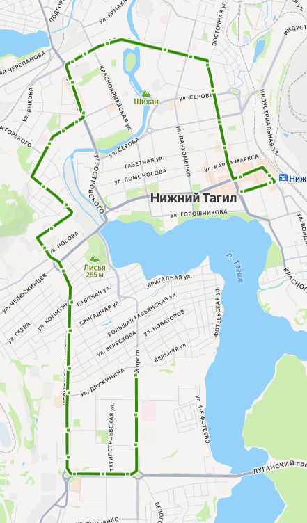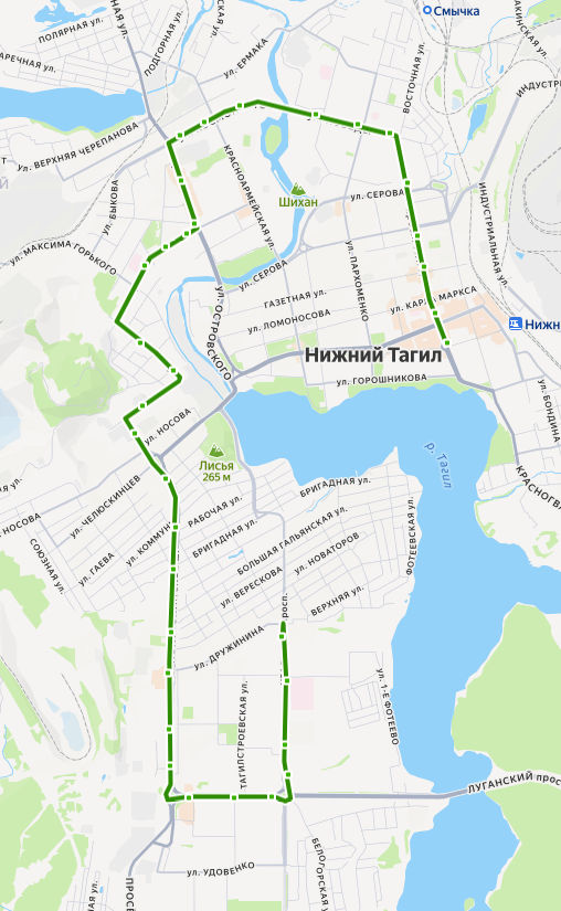 проспект СТРОИТЕЛЕЙ → проспект Мира → Рынок → ул. Циолковского → Строительный техникум → Восточная улица → Кинотеатр Красногвардеец → Приречный микрорайон → Выя → Красноармейская улица → Кинотеатр Урал → ДК Юбилейный → Рудоуправление → Рудоуправление → Магазин Строитель → Школа 23 → Промышленный переулок → Дом молодежи → ул. Кирова → Тагилэнерго → Магазин Глобус → Магазин 5 → У камня → Школа 90 → Гальянский рынок → Универсам → Карьер → ТРЦ Кит → Школа 40 → Октябрьский проспект → ТК Лента → Магазин Минимарт → Уральский клинический лечебно-реабилитационный центр → УРАЛЬСКИЙ проспект