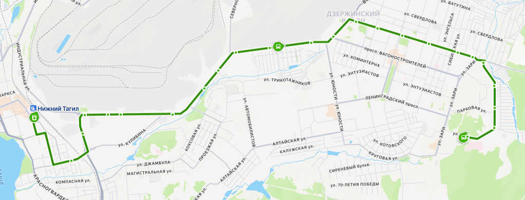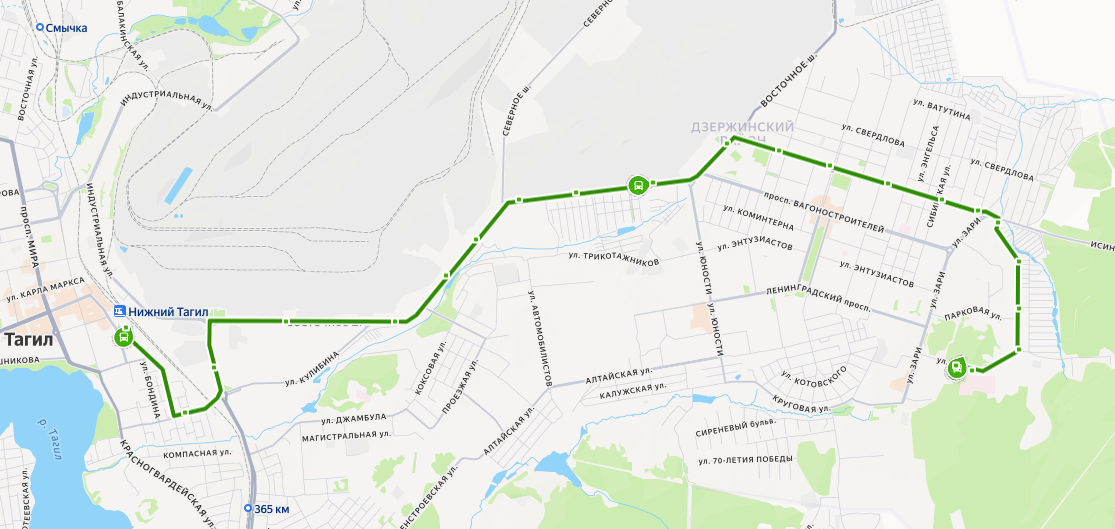 ЖЕЛЕЗНОДОРОЖНЫЙ ВОКЗАЛ → ул. Менделеева → Колонна 2 → Коксохим → ПОПАТ → Восточный рынок → Кокс → Цементный завод → Котельно-радиаторный завод → Трикотажное объединение → Садоводы → Строителей → пр-т Вагоностроителей → ТЦ Спутник → ул. Окунева → пр-т Дзержинского → Баня → ул. Ильича, д. 76 → Храм → Автостоянка → ул. Пихтовая → Сад УВЗ 2 → Профилакторий → БОЛЬНИЦА 1