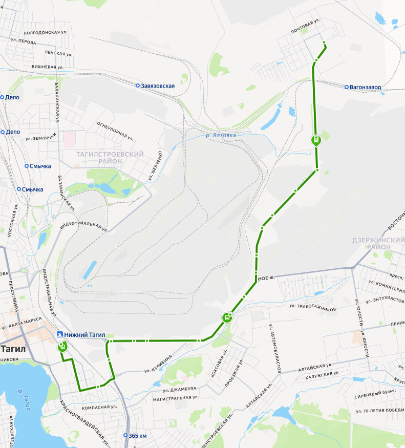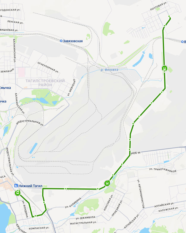 ЖЕЛЕЗНОДОРОЖНЫЙ ВОКЗАЛ → ул. Менделеева → Колонна 2 → Коксохим → ПОПАТ → Восточный рынок → Кокс → Цементный завод → Котельно-радиаторный завод → Подсобное хозяйство → База механизации → Лакокрасочный завод → КМЦ → Завод ЖБИ → Химпарк Тагил → Заводоуправление → ул. Щорса → пос. СЕВЕРНЫЙ, Днепровская улица