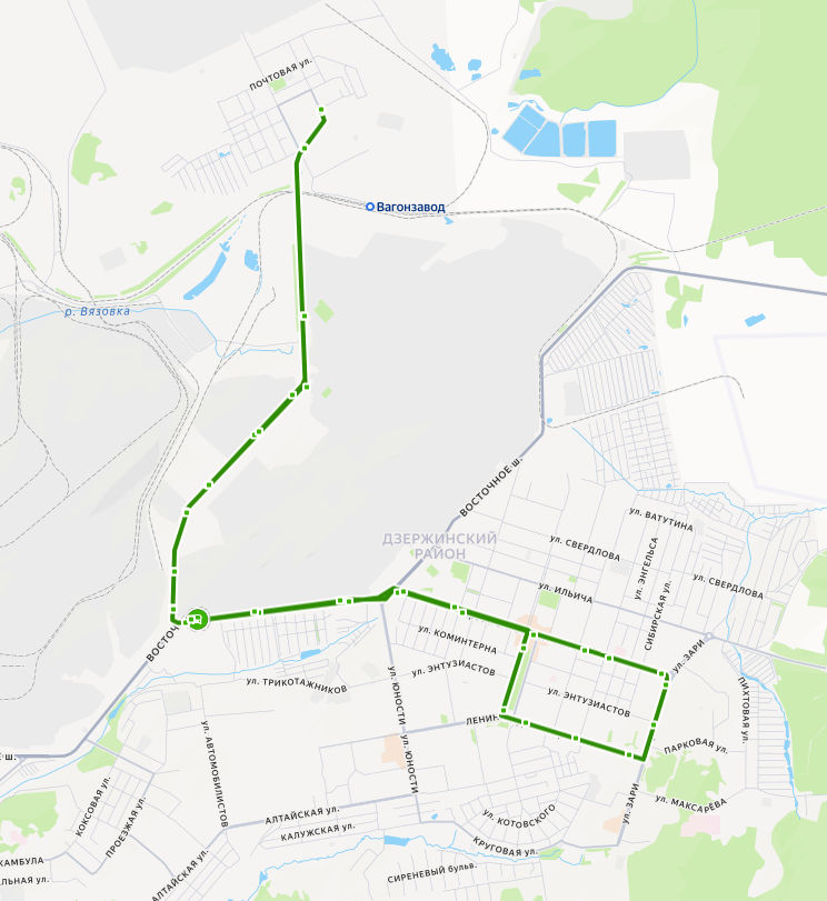 пос. СЕВЕРНЫЙ, ул. Днепровская → ул. Щорса → Заводоуправление → Уралхимпласт → Завод ЖБИ → КМЦ → Лакокрасочный завод → База механизации → Подсобное хозяйство → Трикотажное объединение → Садоводы → Строителей → пр-т Вагоностроителей → Машиностроительный техникум → Кинотеатр Россия → Магазин Зенит → Роддом → Универсам → ПИХТОВЫЕ ГОРЫ