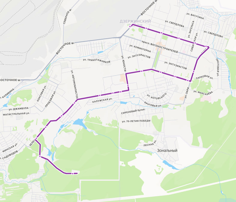 ТУБЕРКУЛЕЗНАЯ БОЛЬНИЦА → Психиатрическая больница → 25 квартал → по требованию → Карьеры → Валегин Бор → Алтайский микрорайон → ул. Бобкова → Школа 20 → Универсам → Поликлиники → площадь Славы → Ленинградский проспект → площадь Танкостроителей → Лицей 39 → Храм → ул. Ильича, д. 76 → Баня → проспект Дзержинского → ул. Окунева → УВЗ