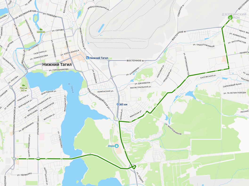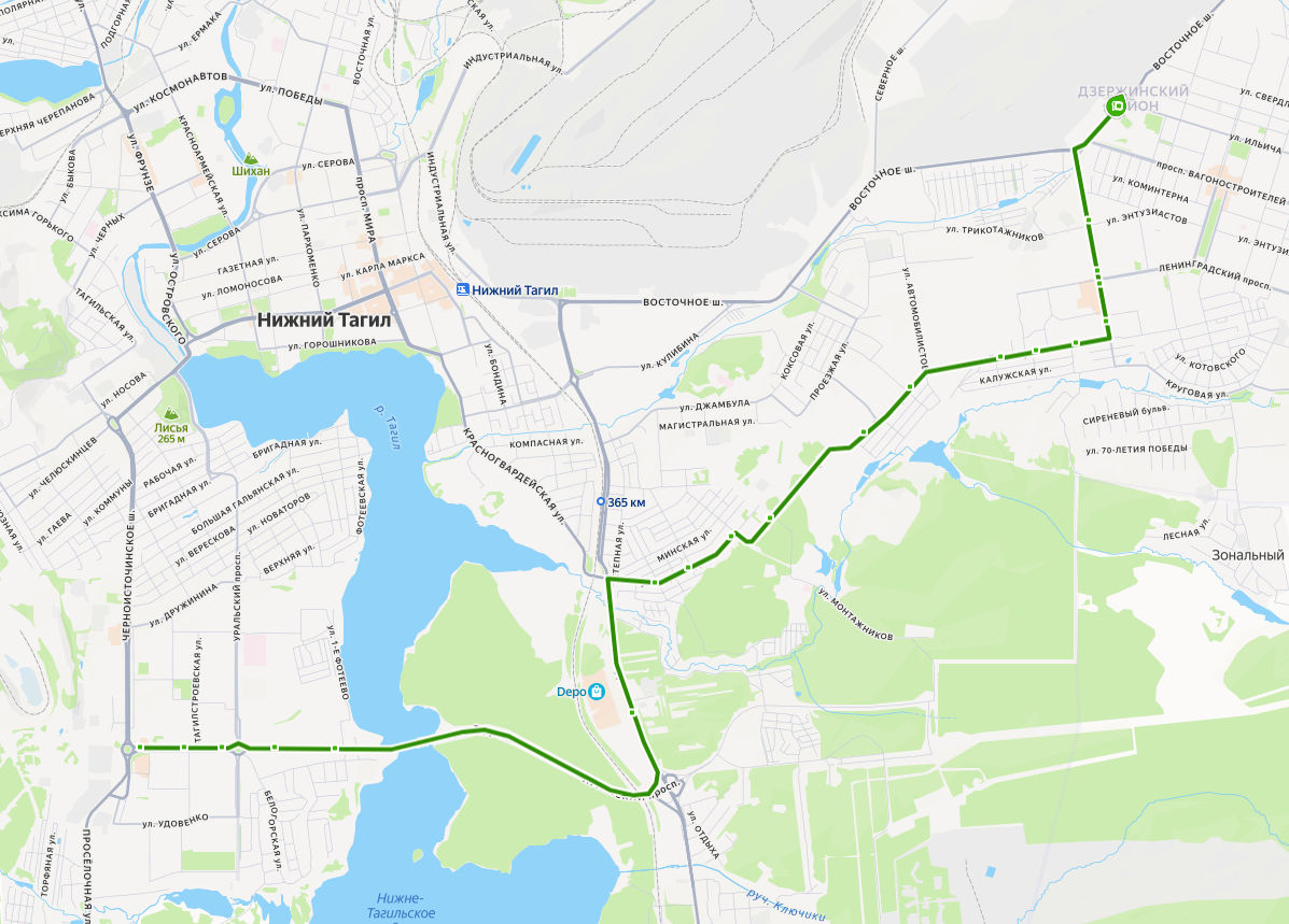 УВЗ → ул. Энтузиастов → Спортивная → ТЦ Стрелец → Универсам → Школа 20 → ул. Бобкова → Алтайский микрорайон → Валегин Бор → Карьеры → 25 квартал → ул. Садоводов, д. 108 → Дальняя улица → ул. Садоводов, д. 40 → ТЦ Лента → Фотеево → Луганский проспект → Октябрьский проспект → Школа 40 → ТРЦ КИТ