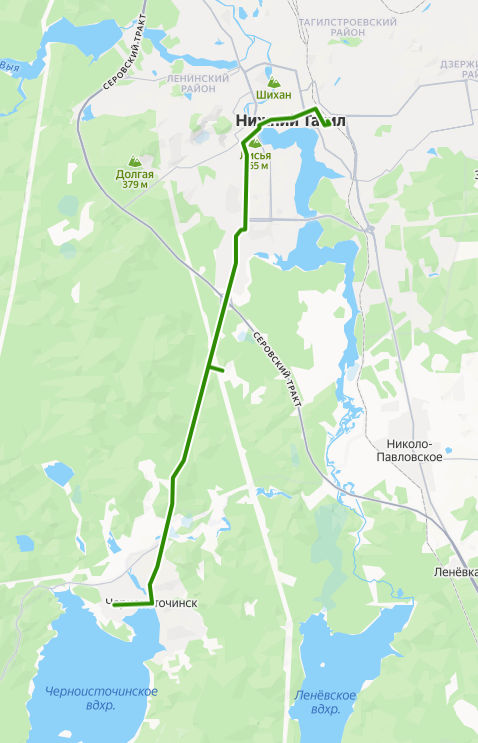 ЧЕРНОИСТОЧИНСК, Московская улица → ул. Ломоносова → Стадион → Булочная → Черноисточинск, ул. Ленина → Санаторий Антоновский → Чащино → Торфяник → Станция Горбуново → Горбуново → Карьер → Гальянский рынок → Школа 90 → Музей → Кинотеатр Современник → Драматический театр → Магазин Алиас → НИЖНИЙ ТАГИЛ, Автовокзал