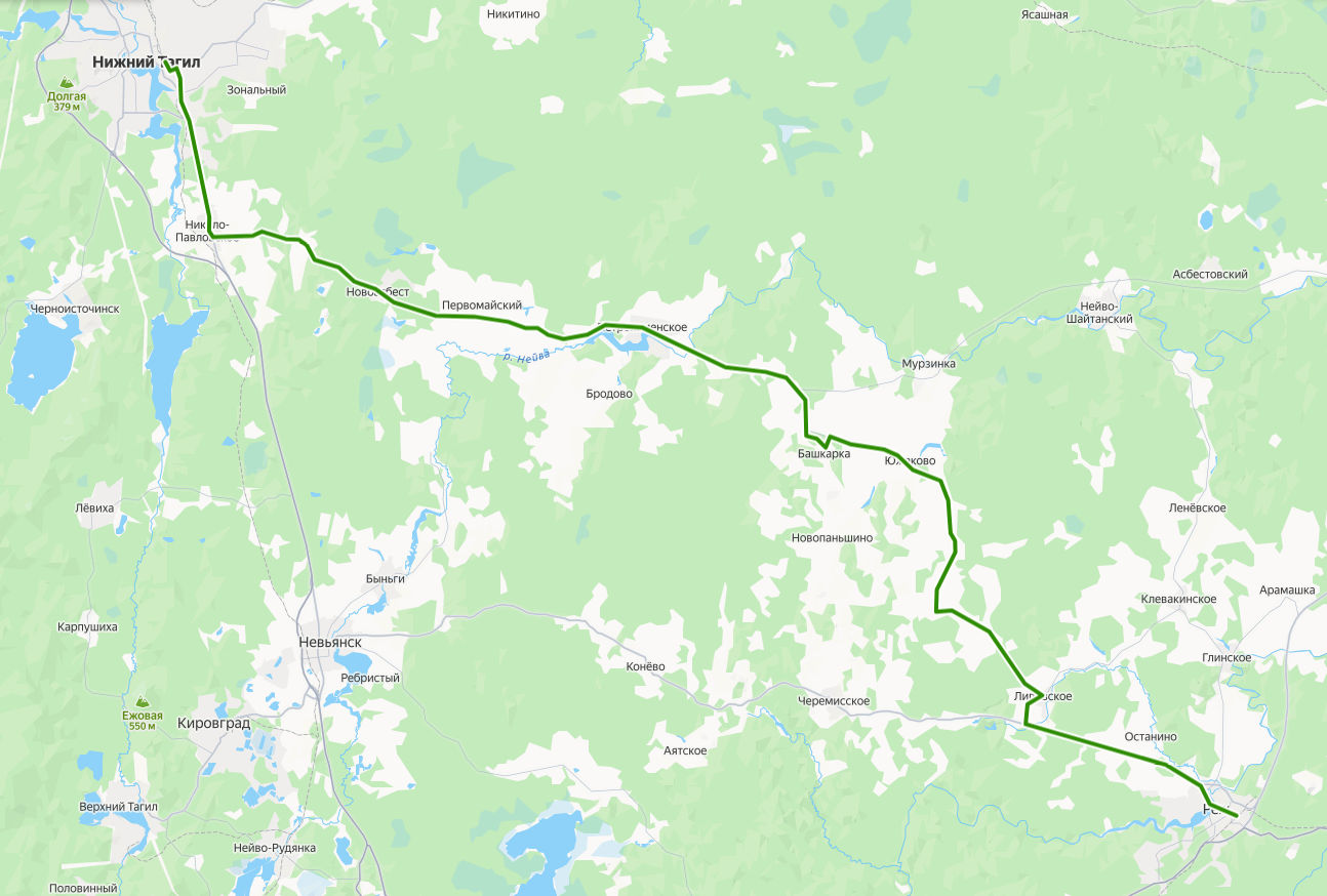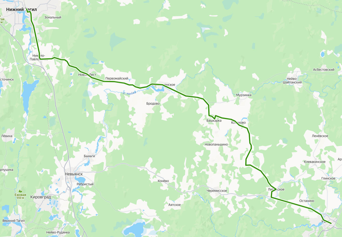 РЕЖ, Автостанция → Центр → Реж, Базар → Кочнево → Сады Малинка → Сады Автомобилист → поворот на Останино → Липовское, ост. 1 → Липовское, ост. 2 → Липовка → Фирсово → Мостовая → Кайгородское → дер. Корнилова → Южаково → поворот на Башкарку → Башкарка → Мокроусское → поворот на Беляковку → Петрокаменское, ул. Ленина → Петрокаменское → Хлебозавод → Темно-Осинова → Краснополье → Первомайский → Реши → Ряжик → Новоасбест → Площадь → Новоасбест, ул. Бажова → поворот на Шиловку → Коттеджный поселок → Николо-Павловское → Шайтанка → Новая → Юбилейная → Коллективные сады → 8 километр → Сады → микрорайон Старатель → Санаторий Руш → микрорайон Ключики → ТЦ Лента → Магазин → 365 километр → Автохозяйство → ул. Менделеева → НИЖНИЙ ТАГИЛ, Автовокзал