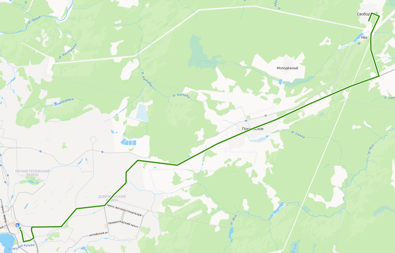 НИЖНИЙ ТАГИЛ, Автовокзал → УВЗ → Подсобное хозяйство → Сортировочная → Сады УВЗ → Птицефабрика → Покровское, Совхоз Майка → ул. Черниговская → Школа → Покровское → Покровское, Совхоз Бычник → Лавочки → поворот на Свободный → Ива → КПП → Свободный, ул. Спортивная → СВОБОДНЫЙ, Автостанция