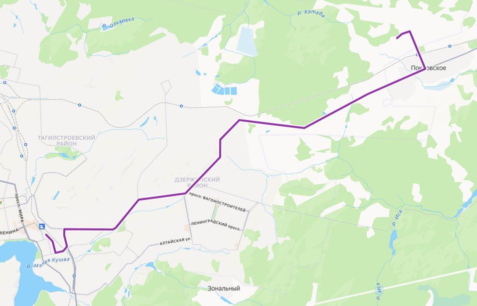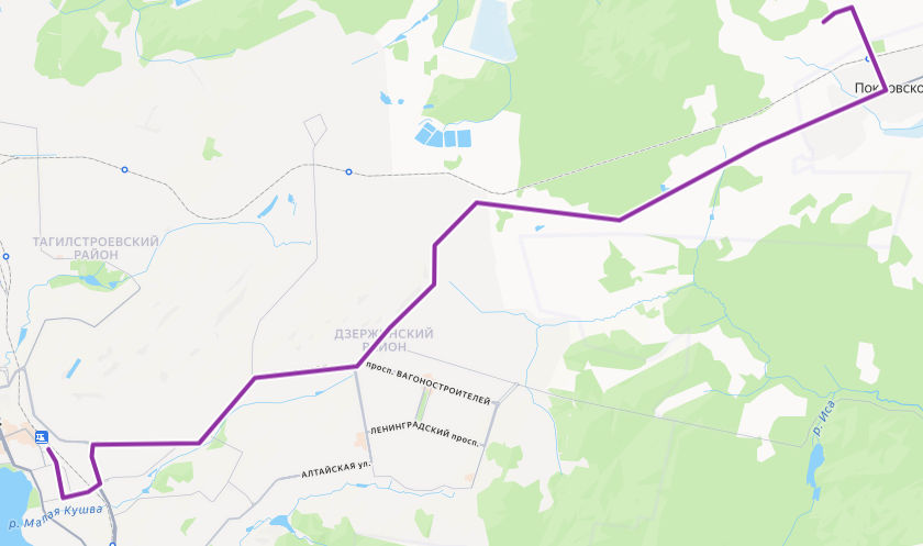 СОКОЛ → Покровское, Переезд → Школа → Черниговская улица → Покровское, Совхоз Майка → Птицефабрика → Сады УВЗ → Сортировочная → Подсобное хозяйство → УВЗ → ул. Менделеева → НИЖНИЙ ТАГИЛ, Автовокзал