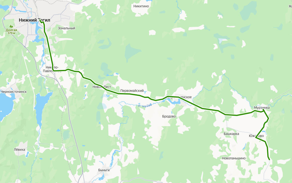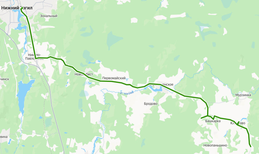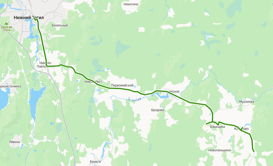 КАЙГОРОДСКОЕ, ул. Ленина → дер. Корнилова → Южаково, ул. Ленина → Южаково, Первомайская улица → Зырянка → дер. Сизикова → Мурзинка → поворот на Мурзинку → поворот на Луговую → поворот на Новую → Мокроусское → поворот на Беляковку → Петрокаменское, ул. Ленина → Петрокаменское → Хлебозавод → Темно-Осинова → Краснополье → Первомайский → Реши → Ряжик → Новоасбест → Площадь → Новоасбест, ул. Бажова → поворот на Шиловку → Коттеджный поселок → Николо-Павловское → Шайтанка → Новая → Юбилейная → Коллективные сады → 8 километр → Сады → микрорайон Старатель → Санаторий Руш → микрорайон Ключики → ТЦ Лента → Магазин → 365 километр → Автохозяйство → ул. Менделеева → НИЖНИЙ ТАГИЛ, Автовокзал