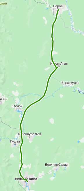 НИЖНИЙ ТАГИЛ, Автовокзал → ул. Евстюниха → поворот на Горноуральский → Малая Лая → поворот на Новую Туру → поворот на Платину → поворот на Полуденную → поворот на Верхотурье → поворот на Заболотный → Новая Ляля, Автостанция → поворот на Новую Лялю → Лобва, Автостанция → поворот на Вагранскую → поворот на Дровяное → Поперечное → Сады 11 километр → Сады 5 километр → 2 километр → Серов, Кинотеатр Юбилейный → Поликлиника 1 → СЕРОВ, Автовокзал