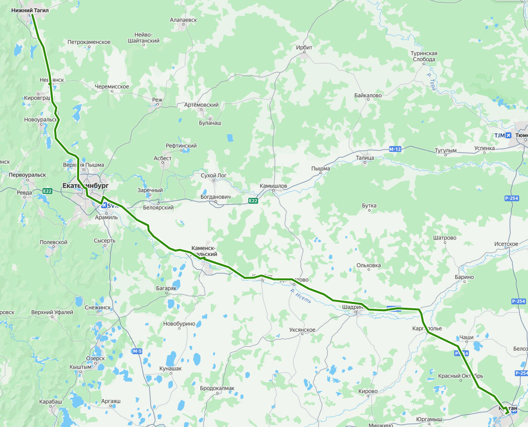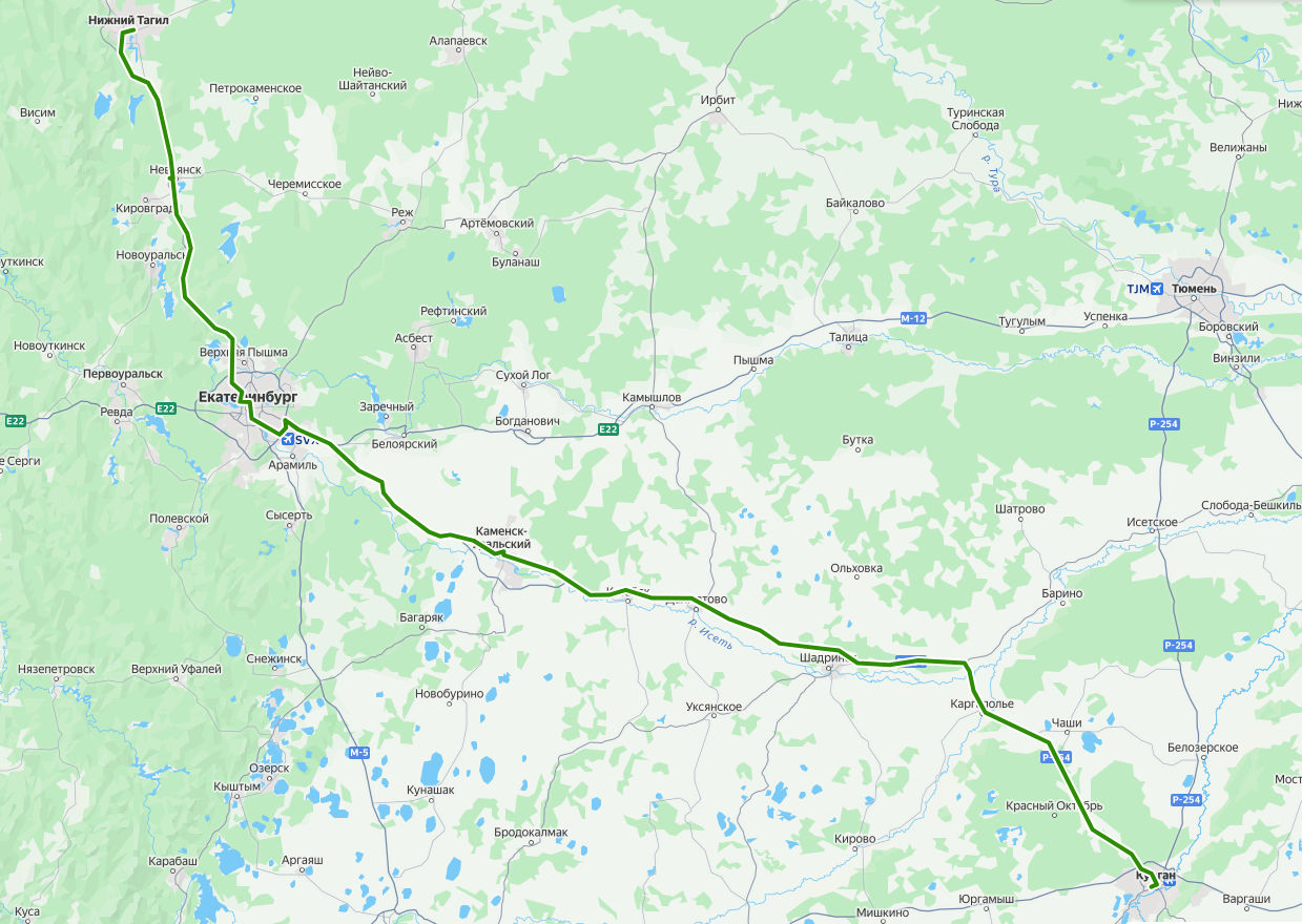 НИЖНИЙ ТАГИЛ, Автовокзал → Невьянск, Автовокзал → Старый соболь → Екатеринбург, Северный автовокзал → Екатеринбург, Южный автовокзал → поворот на Рассоху → поворот на Уральский → Большебрусянское → Логиново → Марамзино → дер. Златогорова → поворот на Совхозный → поворот на Шиловский → Часовая → Покровское, Храм → дер. Малая Белоносова → Каменск-Уральский, Автовокзал → Новоисетское → Колчедан → Водолазово → поворот на Гравийный → поворот на Ипатову → поворот на Оконечникову → поворот на Шевелеву → поворот на Катайск → поворот на Далматово → Профилакторий → поворот на Шадринск → поворот на Маслянское → поворот на Крестовское → поворот на Огонек → поворот на Ильтяково → поворот на Плоскую → поворот на Сибирки → Развилка → поворот на Нечунаеву → Каргаполье, Автостанция → поворот на Житниковское → поворот на Чаши → поворот на Деулину → поворот на Малое Банниково → поворот на Чашинский → Илецкий → поворот на Иковку → поворот на Старый Просвет → поворот на Просвет → КУРГАН, Автовокзал