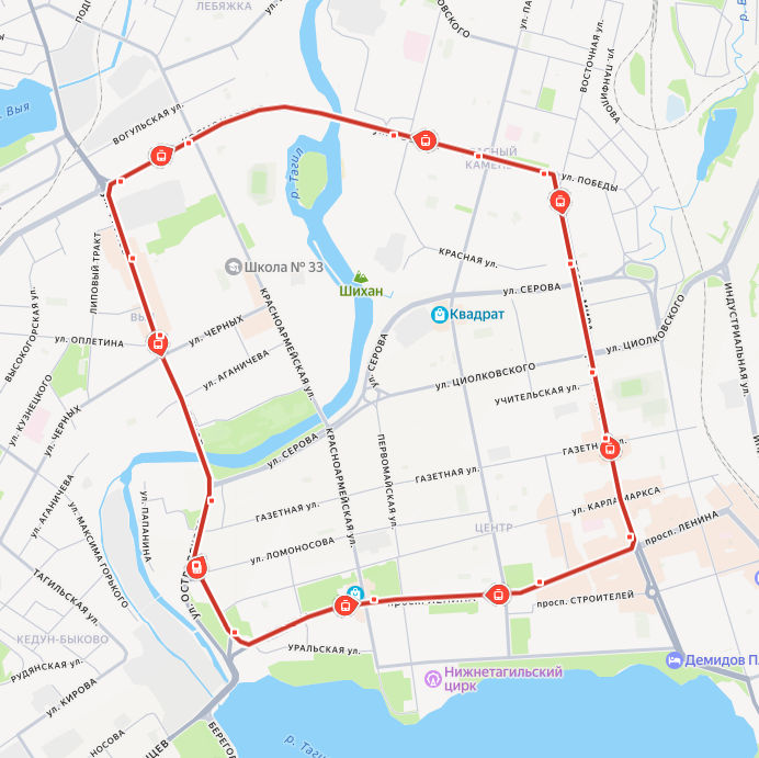 ул. ОСТРОВСКОГО → Музей → Театр кукол → Драматический театр → проспект Мира → Рынок → ул. Циолковского → Строительный техникум → Восточная улица → Кинотеатр Красногвардеец → Приречный микрорайон → Красноармейская улица → Кинотеатр Урал → ДК Юбилейный → Рудоуправление → Новокомсомольская → ул. ОСТРОВСКОГО