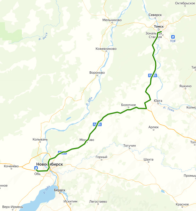 АЭРОПОРТ ТОЛМАЧЕВО → НОВОСИБИРСК, Автостанция железнодорожного вокзала → Садовый → Барлак → Сокур → Дачи → Кошево → Мошково, ул. Западная → База → Мошково, трасса → Вороново → поворот на Ояш → поворот на Эстонку → Чахлово → Болотное, Автостанция → по требованию → поворот на Таскаево → поворот на Юргинский → поворот на Проскоково → поворот на Заозёрный → Милютино → поворот на Мальцево → поворот на Зеледеево → поворот на Варюхино → Алаево → СНТ Медведка → поворот на Курлек → поворот на Калтай → поворот на Кандинку → поворот на Барабинку → поворот на Кафтанчиково → Тахтамышево, ост. 2 → Тахтамышево, ост. 1 → Черная Речка, ост. 2 → Черная Речка, ост. 1 → АЗС → ТОМСК, Автовокзал