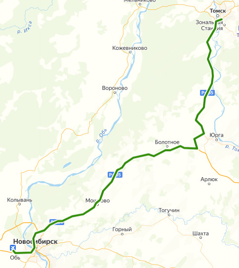 ТОМСК, Автовокзал → АЗС → Черная Речка, ост. 1 → Черная Речка, ост. 2 → Тахтамышево, ост. 1 → Тахтамышево, ост. 2 → поворот на Кафтанчиково → поворот на Барабинку → поворот на Кандинку → поворот на Калтай → поворот на Курлек → СНТ Медведка → Алаево → поворот на Варюхино → поворот на Зеледеево → поворот на Мальцево → Милютино → поворот на Заозёрный → поворот на Проскоково → поворот на Юргинский → поворот на Таскаево → по требованию → Болотное, Автостанция → Чахлово → поворот на Эстонку → поворот на Ояш → Вороново → Мошково, трасса → База → Мошково, Западная улица → Кошево → Дачи → Сокур → Барлак → Садовый → ЖМ Ботанический → НОВОСИБИРСК, Автостанция железнодорожного вокзала