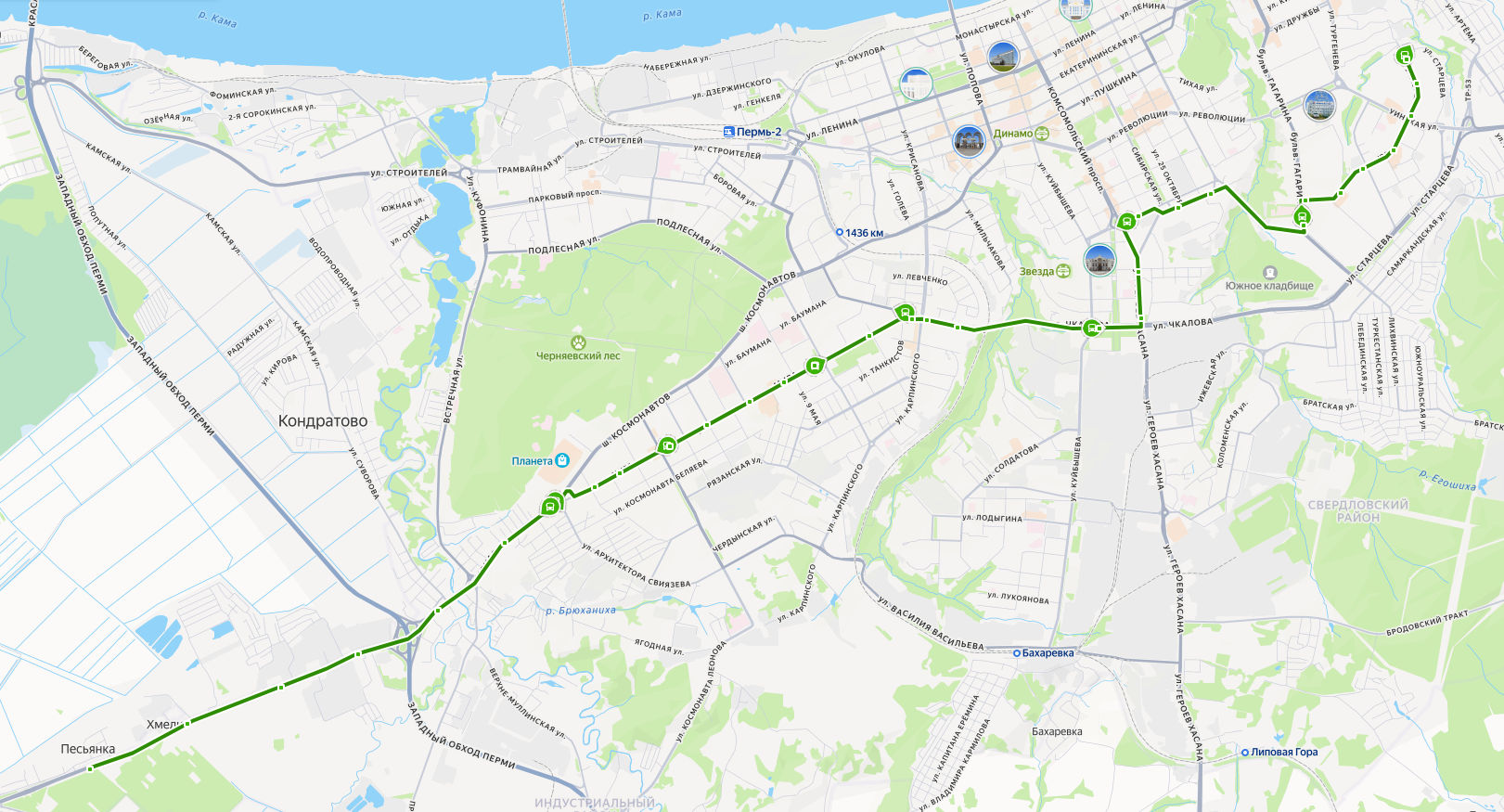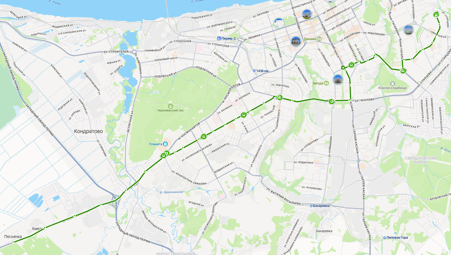 ПЕСЬЯНКА → Хмели → Совхозная улица → Спортшкола Олимпиец → Верхние Муллы → Школа 107 → Ипподром → ул. Давыдова → ул. Леонова → ул. Одоевского → ДК Гагарина → ул. 9 Мая → ул. Советской Армии → ул. Чайковского → Стахановская улица → ул. Карпинского → Самолётная улица → ул. Куйбышева → ул. Чкалова → ул. Соловьёва → Комсомольская площадь → Город трудовой доблести → ул. Чернышевского → Авторадио → бульвар Гагарина → ул. Ушинского → Пушкарская улица → Подольская улица → Уинская улица → Гимназия 2 → САДОВЫЙ микрорайон