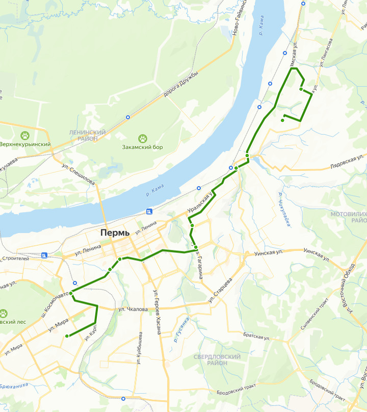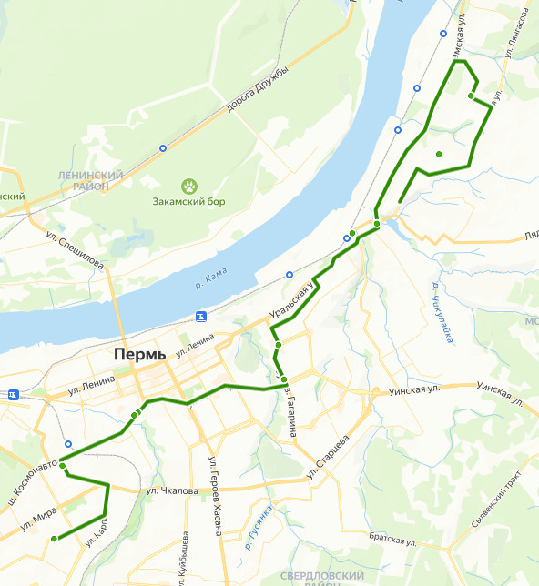 ТЕАТР ИРОНИЧНАЯ КОМПАНИЯ → ул. Засулич → МЖК → проспект Декабристов → ул. Сивкова → Стахановская улица → ул. Снайперов → ул. Баумана → ул. Блюхера → ул. Мильчакова → Автовокзал → Стадион Динамо → проспект Комсомольский → Дворец спорта Орленок → ул. Революции → ул. Островского → Поликлиника Пичугина → ул. Макаренко → Студенческая улица → пл. Дружбы → ул. Лебедева → ул. Землячки → Дворец спорта Молот → Рабочий поселок → ул. 1905 года → площадь Восстания → Кондитерская фабрика Пермская → Нижегородская улица → Язовая → Завод Машиностроитель → Балмошная → Автотранспортный колледж → ул. Франко → Целинная улица → Больница → мкр. Вышка 2 → ул. ГАШКОВА