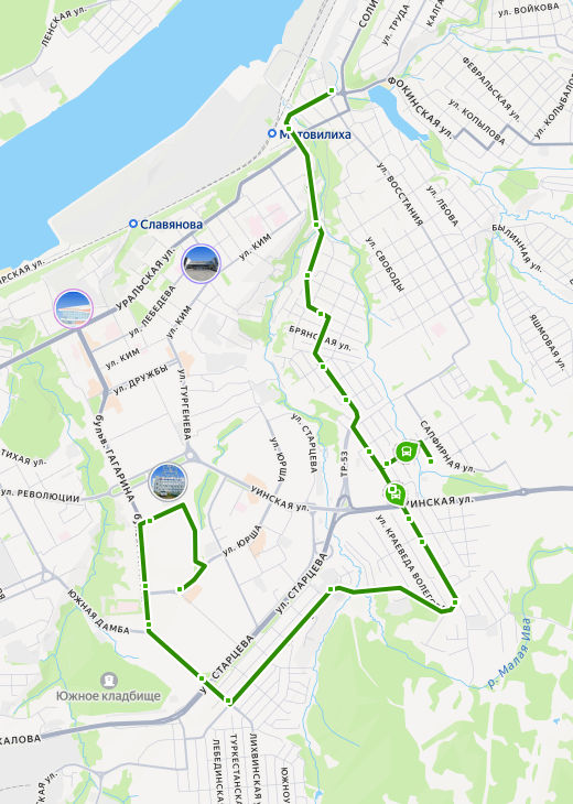 площадь ВОССТАНИЯ → ул. 1905 года → ул. Обросова → Каспийская улица → Кунгурская улица → Почта → ул. Радищева → микрорайон Костарёво → Сапфирная улица → Лесная улица → мкр. Ива-1 → ул. Грибоедова → Июльская улица → микрорайон Архиерейка → микрорайон Архиерейка → Водогрейная котельная 3 → Самаркандская улица → ул. Старцева → Авторадио → ул. Ушинского → ул. Патриса Лумумбы → ул. УШИНСКОГО