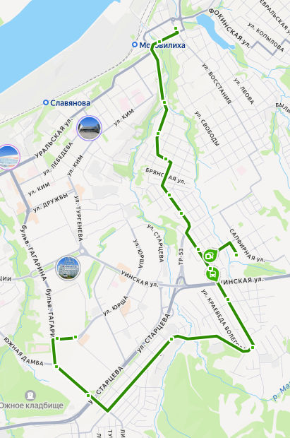 ул. УШИНСКОГО → б-р Гагарина → Авторадио → ул. Старцева → Водогрейная котельная 3 → мкр. Архиерейка → ул. Июльская → мкр. Ива-1 → ул. Сапфирная → ул. Лесная → мкр. Костарёво → ул. Радищева → Почта → ул. Кунгурская → ул. Каспийская → ул. Обросова → ул. 1905 года → пл. ВОССТАНИЯ