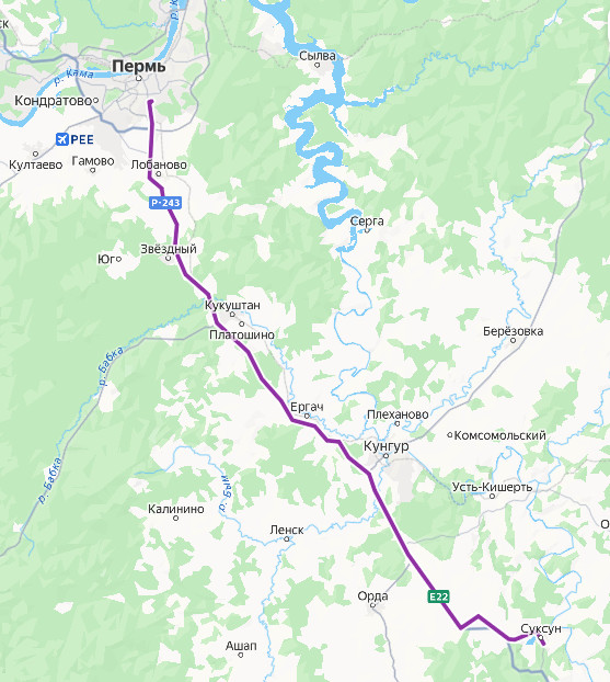 ПЕРМЬ, Автостанция Южная → Кояново → Пионерлагерь → поворот на Кукуштан → поворот на Новое Платошино → поворот на Мартыново → поворот на Кыласово → поворот на Шадейку → поворот на Кунгур → поворот на Семсовхоз → поворот на Голдыревский → поворот на Южный → Сабарка → Опалихино → Суксунский оптико-механический завод → СУКСУН, Автостанция