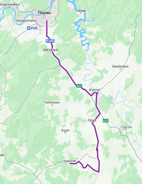 ПЕРМЬ, Автостанция Южная → мкр. Липовая Гора → Кояново → Пионерлагерь → поворот на Кукуштан → поворот на Новое Платошино → поворот на Байболовку → поворот на Мартыново → поворот на Кыласово → Шавкуново → поворот на Шадейку → Кунгур, Автостанция → Новосёлы → Садоягодное → поворот на Усть-Кишерть → Голдыри → Орда, ул. Труда → Орда, Автостанция → поворот на Белое Озеро → Шляпники → Подберёзово → Берёзовая Гора → поворот на Медянку → Медянка → Михино → Иштеряки → Воскресенское → Телёс → Усть-Телёс → Иренский → УИНСКОЕ, Автостанция