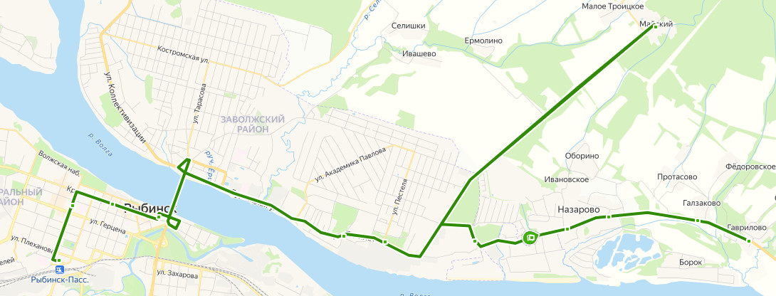 ГАВРИЛОВО → Галзаково → Назарово → Сельсовет → СНТ Дружба → Мелкая улица → МАЙСКИЙ → Слип → Верфь братьев Нобель → Соборная площадь → Крестовая улица → Сенной рынок → РЫБИНСК, Железнодорожный вокзал