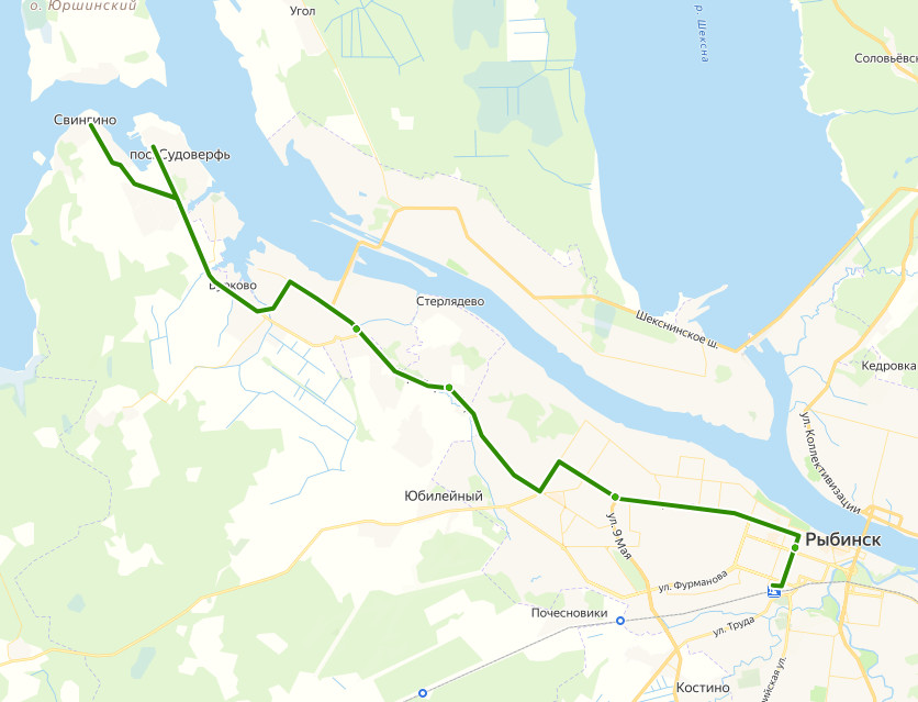 СУДОВЕРФЬ → Якушево → Погорелка → СВИНГИНО → Погорелка → Якушево → Залужье → Диково → Болтино → Бурково → ул. Алябьева → ул. Смирнова → Кабельный завод → Храм Александра Невского → Макарово → ул. Бабушкина → СК Метеор → площадь Жукова → Солнечная улица → НПО Сатурн → Универмаг Юбилейный → ул. Пушкина → РЫБИНСК, Железнодорожный вокзал