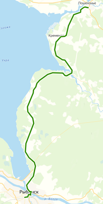 ПОШЕХОНЬЕ, Автостанция → Дьяконово → Ясная Поляна → Рождествено → Малая Луха, ост. 1 → Малая Луха, ост. 2 → поворот на Сваруху → Кременево, ост. 1 → Кременево, ост. 2 → Крестцы, ост. 1 → Крестцы, ост. 2 → Обновленское → Панфилово → Лапушка → Окулово → Пачеболка → Роканово → Ляга → Милюшино → поворот на Ивановское → Осташево → Лаврентьево → Огарково, ост. 2 → Огарково, ост. 1 → Дымовское → Савинское → Волково → СНТ Полиграфист-4 → поворот на Середнево → Соловьевское → 7 километр → Соборная площадь → РЫБИНСК, Автовокзал