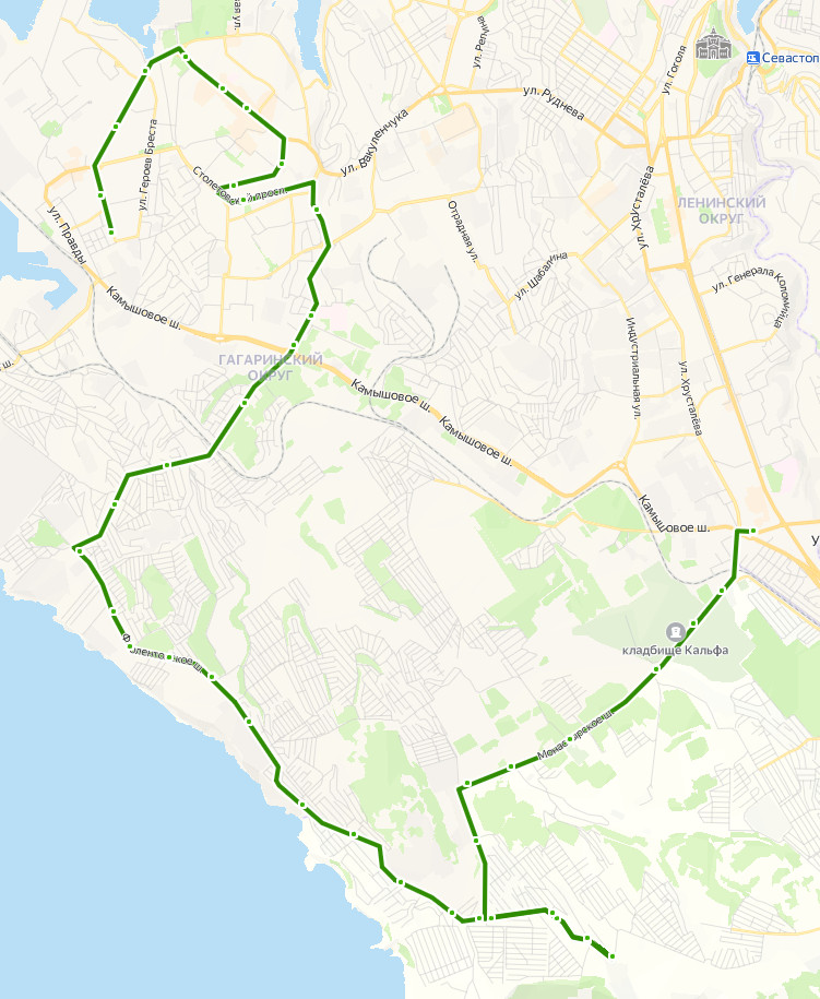 5 км БАЛАКЛАВСКОГО шоссе → Мемориальное кладбище → пос. Кальфа → Юхарина балка → Газовая заправка → Подсобное хозяйство → СНТ Катюша → База отдыха подводников → Створ → СНТ Успех → Монастырь → Фиолент → Монастырь → СНТ Успех → Створ → Царское село → База отдыха Каравелла → База отдыха Фиолент → Маяк → Рабочий поселок → СНТ Факел → Водограй → СНТ Маяк 2 → Муссон → Автобат → Сады → Дачи → Левая Гераклея → Фиолентовское кольцо → Медгородок → Добрострой → пр-т Столетовский → ул. Колобова → Школа 37 → ул. Адмирала Юмашева → пр-т Октябрьской Революции → Парк Победы → Пляж Омега → пр-т Героев Сталинграда → Поликлиника Портовая → ул. БОРИСА МИХАЙЛОВА