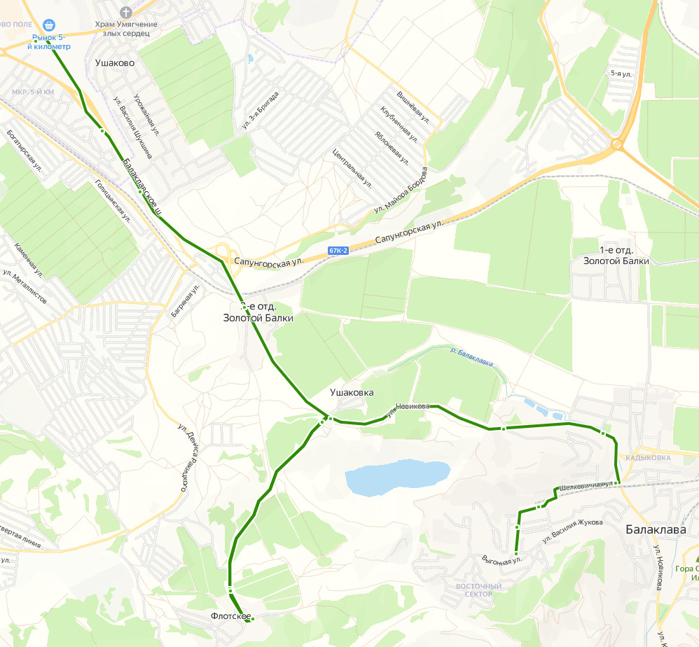 5 км БАЛАКЛАВСКОГО шоссе → 6 км Балаклавского шоссе → 7 км Балаклавского шоссе → 3 отделение Золотой Балки → 11 км Балаклавского шоссе → ул. Ягодная → Флотское → ул. Ягодная → 11 км Балаклавского шоссе → Карьер → Золотая балка → ул. Шелковичная → Магазин Варшава → ул. Ситникова → КАДЫКОВСКИЙ КОМБИНАТ, Балаклава