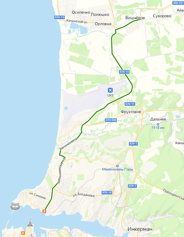 ВИШНЕВОЕ → Качинская улица → Подгорная улица → Орловский мост → Водоканал → Качинское шоссе → Белевичи → Любимовский мост → Совхоз Софьи Перовской → Турбаза Мокроусова → Виноградники → Интернат → Кинотеатр Моряк → ул. Леваневского → СЕВАСТОПОЛЬ, площадь Захарова