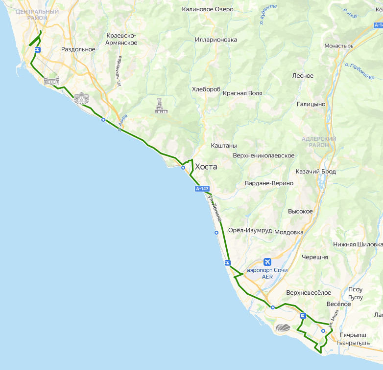 СОЧИ, ТРЦ Моремолл → Стоматология → Экспресс-Лайн → Железнодорожный вокзал Сочи → Сбербанк → Органный зал → Гостиница Сочи → ул. Театральная → Пансионат Светлана → Цирк → Санаторий Яна Фабрициуса → Стадион → Санаторий Металлург → Центральный военный санаторий Ворошилова → Санаторий Правда → Санаторий Приморье → Санаторий Заря → Санаторий Зеленая роща → Малый Ахун → Санаторий Красный штурм → Звездочка → Хоста, Мост → ул. 50 лет СССР, Авмакасса → Санаторий Волна → Филиал санатория Аврора → Кудепста → Пансионат Бургас → Пансионат Южный → Пансионат Знание → Пансионат Фрегат → Санаторий Известия → Санаторий Изумруд → Вагонное депо → ул. Лавровая → Железнодорожный вокзал Адлер → Автошкола → ул. Взлетная → Санаторий Южное Взморье → Кинотеатр Комсомолец → Торговый центр Новый век → Птицефабрика → Парк Южные культуры → Мирный → мкр. Блиново → Зорька → Сельсовет → Светофор → Казачий рынок → Веселое → Псоу → Торговый дом Подкова → Совхоз Россия → Екатерининский квартал → Отель Бридж → ул. Старообрядческая → Чистые пруды → Александровский сад → Сочи Парк Отель → СИРИУС, Железнодорожный вокзал Олимпийский парк