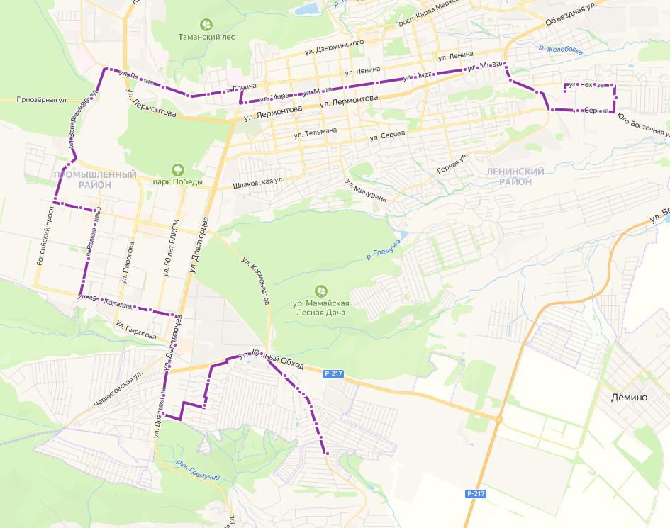 СНТ МЕЧТА → СНТ Импульс → СНТ Яблочко → СНТ Юбилейное 1 → 566 квартал → СНТ Оптимист → СНТ Росгипрозем → СНТ Лесовод → Алмазная улица → Тюльпановая улица → бульвар Архитекторов → ЖК Белый Город → Автостанция 1 → Южный рынок → ул. Доваторцев → ул. 45 Параллель → ГСК Ветеран → ул. Салова → ЖК Европейский → ЖК Европейский 4 → ул. Рогожникова → ул. Рогожникова → мкр. Перспективный → Российский проспект → Исторический парк → Диагностический центр → Приозерная улица → СКФУ → Универсам 1 → площадь 200-летия → Водоканал → ул. Пржевальского → Социалистическая улица → Краевая больница Семашко → ул. Мира → Краснофлотская улица → ул. Толстого → Медицинский университет → ул. Пушкина → Автовокзал → ул. Розы Люксембург → ул. Маяковского → ул. Добролюбова → переулок Чкалова → переулок Расковой → ул. Достоевского → ул. Достоевского → ул. Севрюкова → ул. Чехова → Тубдиспансер → Широкая улица → аллея Героев → ул. Мимоз → ул. Мимоз → ул. Чехова → Магазин Магнит → ТК на ЧЕХОВА, Батутный парк