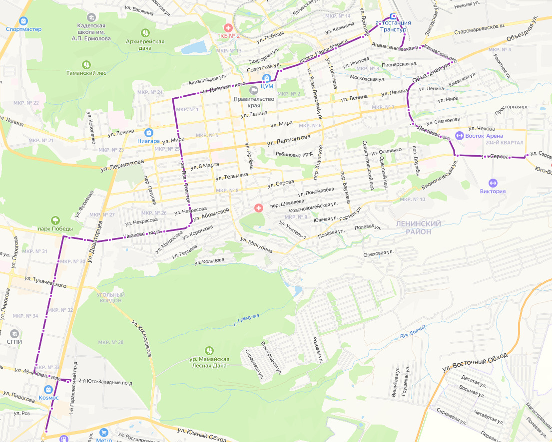 АВТОСТАНЦИЯ 1 → Южный рынок → пр-д 2 Юго-Западный → ул. Доваторцев → ул. 45 Параллель → 524 квартал → Школа 23 → Школа 29 → ТК Славяновский → ул. Тухачевского → Школа 15 → Кинотеатр Салют → Школа 17 → пр-д Фестивальный → Профцентр → ул. Чайковского → ул. Зои Космодемьянской → ул. Шпаковская → пр-д Невельский → ул. Тельмана → ул. Лермонтова → Школа 6 → ул. Дзержинского → Поликлиника 1 → Дом профсоюзов → площадь Ленина → пр-т Карла Маркса → ул. Голенева → Гостиница Интурист → площадь Генерала Ермолова → Автостанция Восточная → Железнодорожный вокзал → Школа Скакуна → Таксопарк → ул. Объездная → пр-д Деповский → ул. Достоевского → ул. Севрюкова → ул. Чехова → Тубдиспансер → ул. Широкая → аллея Героев → 204 КВАРТАЛ