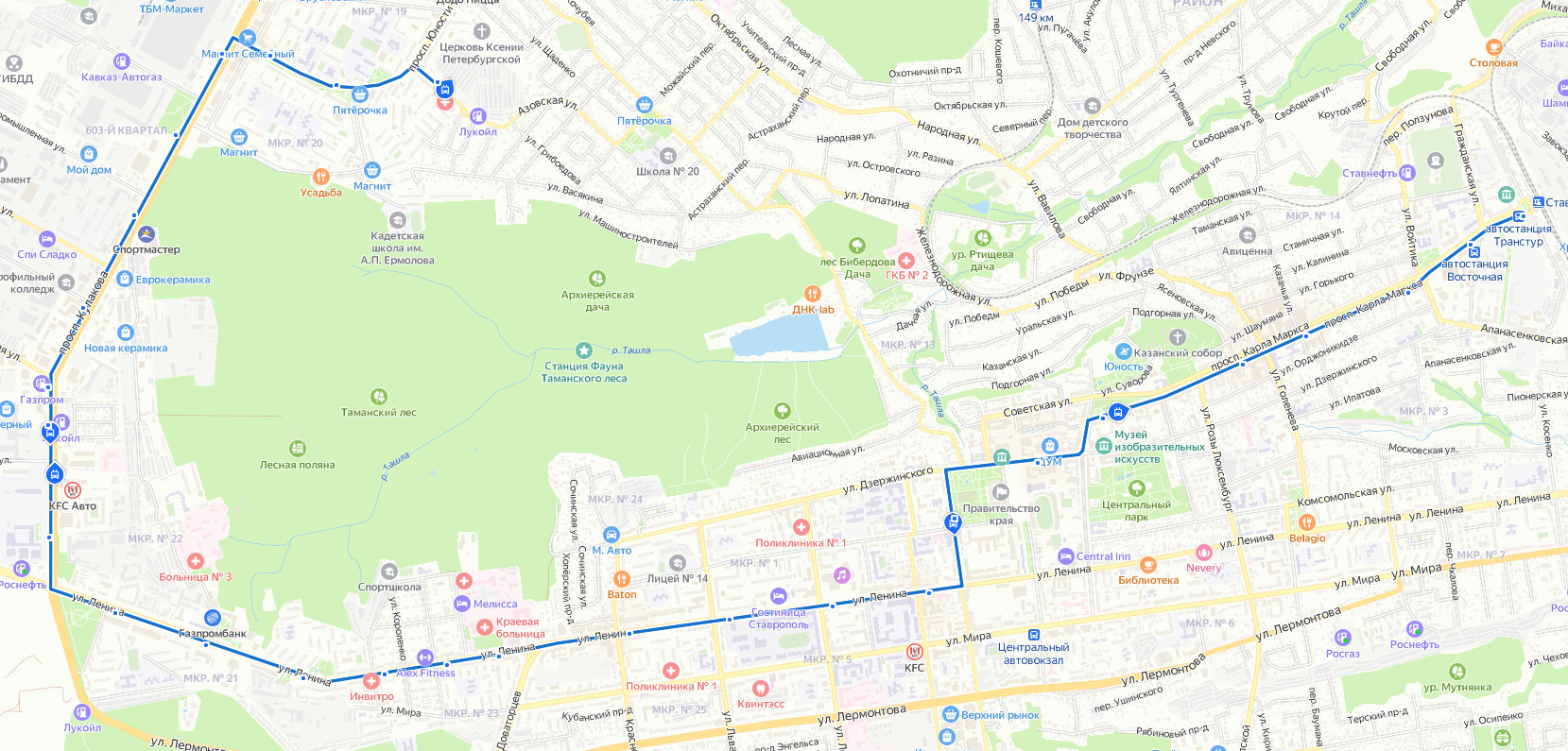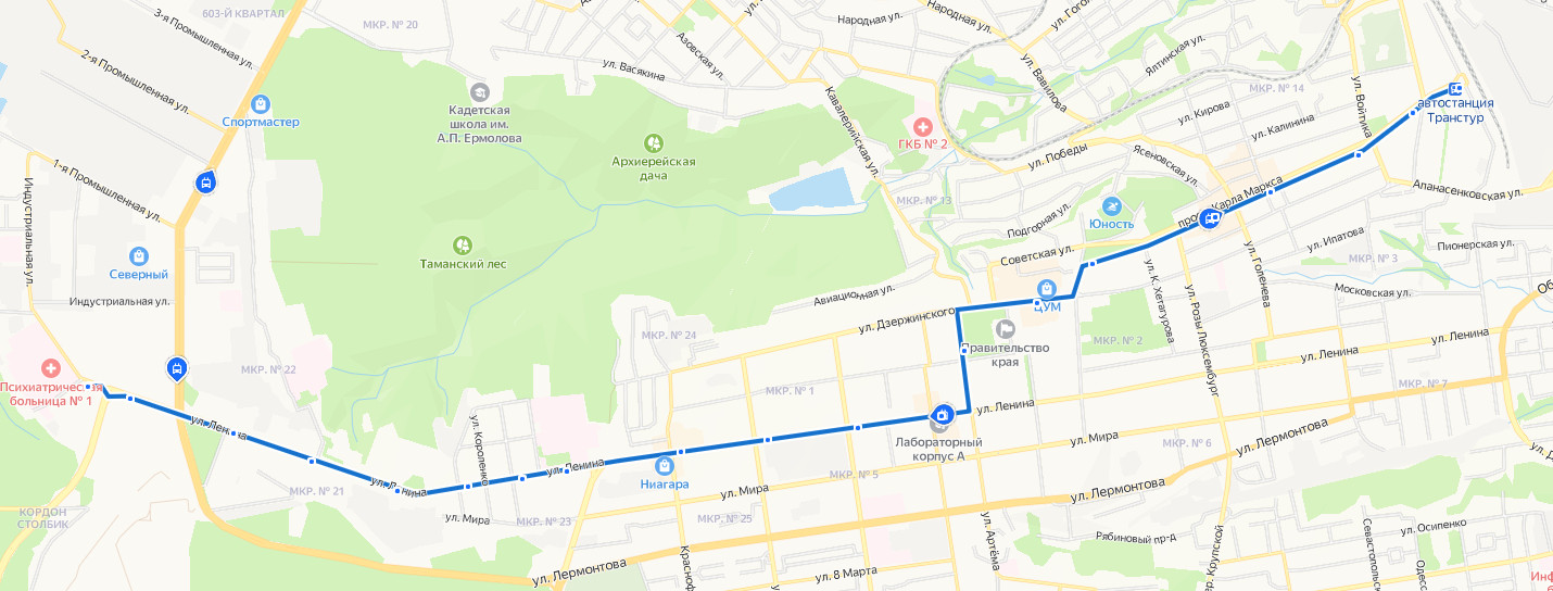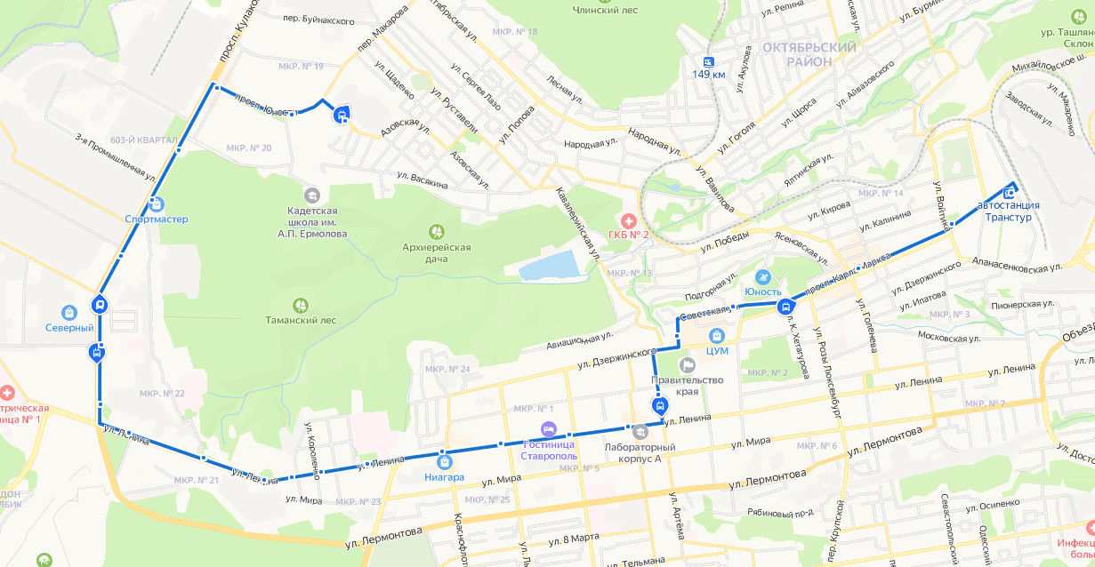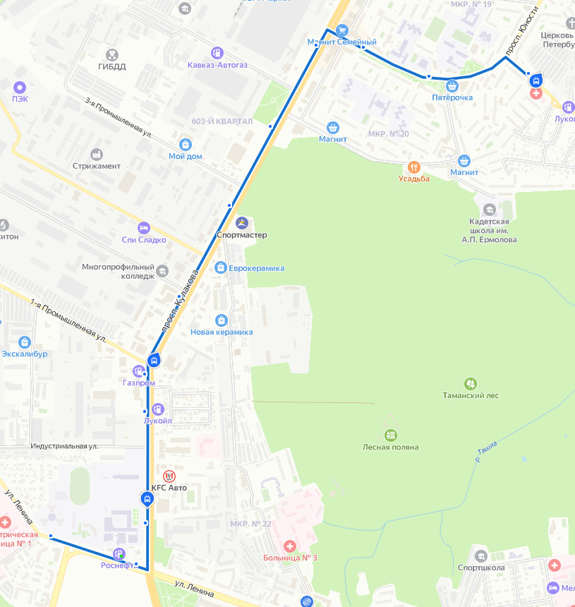 ПОЛИКЛИНИКА 9 → пр-т Юности → Индустриальный парк → Индустриальный парк → ул. Заводская → Магазин Спортмастер → Малая Химия → ул. 1 Промышленная → Завод Энергомера → СКФУ → СКФУ → СтавНИИГИМ