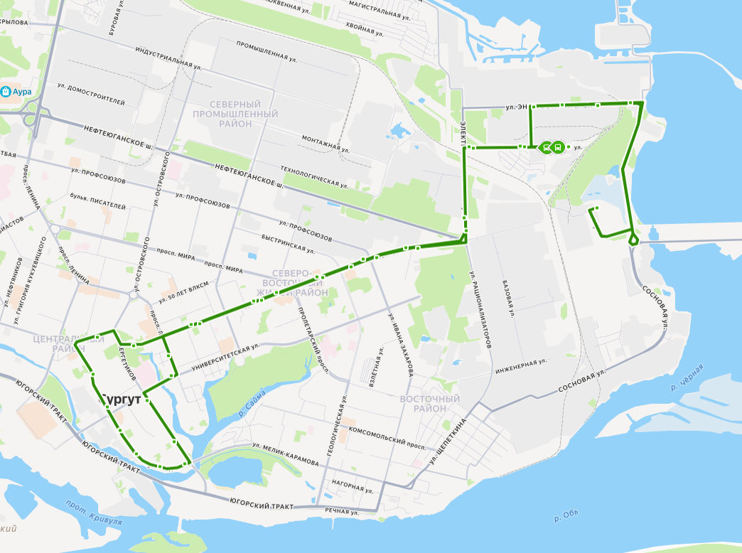 пос. ФИНСКИЙ → ГРЭС-2 → ул. Энергостроителей → пос. Кедровый-2 → пос. Кедровый → ул. Пионерская → ЖБИ → СУ-63 → Кооперативные гаражи → 33 микрорайон → ДОСААФ → Музейный центр → ДК Строитель → Газпром → пр-т Ленина → Университет → Горвоенкомат → ул. Гагарина → Дом купца Клепикова → 10 микрорайон → Мемориал Славы → Филармония → Центральная библиотека → ул. Майская → ул. Энергетиков → ДК Строитель → ГАИ → 32 микрорайон → ТЦ Богатырь → Кооперативные гаражи → СУ-63 → ЖБИ → Пионерская улица → пос. Кедровый → пос. Кедровый-2 → ул. Энергостроителей → Пожарная часть → пос. ФИНСКИЙ