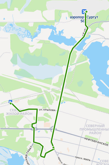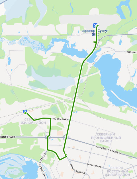 ЖЕЛЕЗНОДОРОЖНЫЙ ВОКЗАЛ → ул. Крылова → ул. Грибоедова → мкр. ПИКС → Александрия → ул. Семена Билецкого → 42 микрорайон → 35 микрорайон → Югорский тракт → Парк Кедровый лог → Больничный комплекс → Магазин Восход → Сургут, УБР → Автовокзал → УТТ-1 → МК-114 → 5 километр → пос. Таежный → Гостиница Полет → АЭРОПОРТ