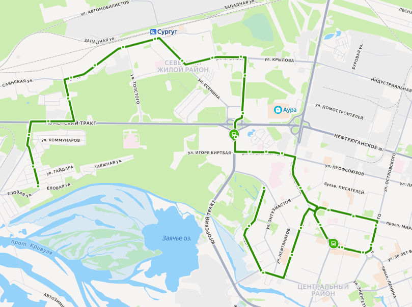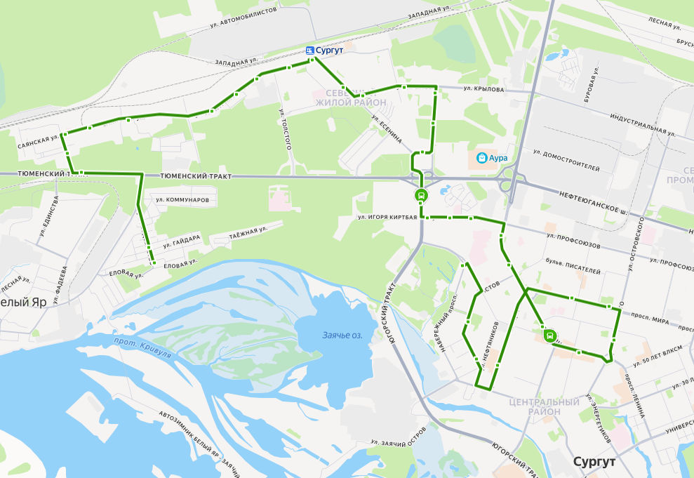 пос. СНЕЖНЫЙ → ул. Геодезистов → поворот на Юность → пос. Юность → Школа → Почта → МК-32 → Контейнерная → Привокзальная → Станция Сургут → Железнодорожный вокзал → ул. Крылова → ул. Грибоедова → микрорайон ПИКС → Александрия → ул. Семена Билецкого → 42 микрорайон → 35 микрорайон → ул. Киртбая → 5 А микрорайон → Нефть Приобья → Автовокзал → УБР → Кинотеатр Аврора → ул. Бахилова → Школа 1 → проспект Мира → Магазин Даниловский → ул. Кукуевицкого → Магазин Изумруд → Музыкальный колледж → БОЛЬНИЧНЫЙ КОМПЛЕКС