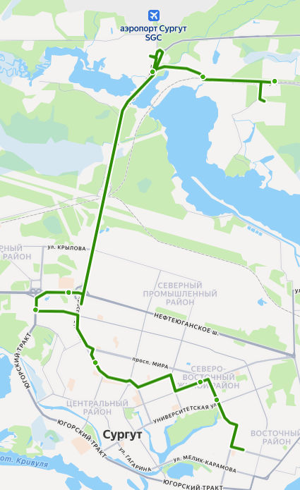 пос. ЛЕСНОЙ → СОТ Прибрежный-2 → СОТ Дорожник → пос. Дорожный → МК-37 → пос. Таежный → пос. Таежный → 5 километр → МК-114 → УТТ-1 → ТРЦ Аура → 35 микрорайон → ул. Киртбая → 5 А микрорайон → Нефть Приобья → Автовокзал → УБР → Кинотеатр Аврора → ул. Бахилова → ул. 50 лет ВЛКСМ → Спорткомплекс → УВД → ГАИ → 32 микрорайон → Парк За Саймой → 24 микрорайон → 25 микрорайон → Югорская улица → Комсомольский проспект → МАГАЗИН МОСКВА