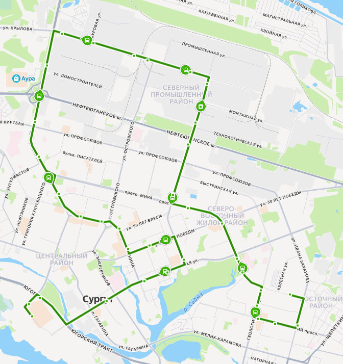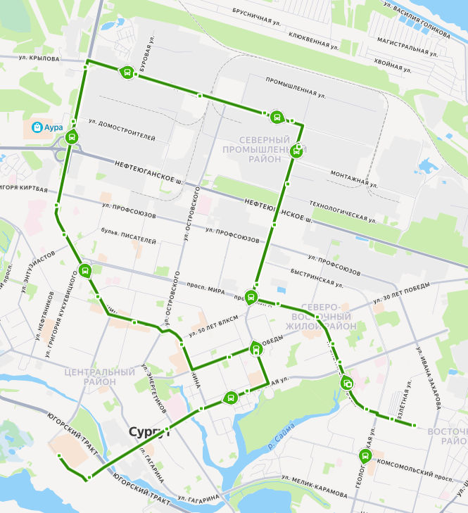 ПРОЛЕТАРСКИЙ проспект → 25 микрорайон → 24 микрорайон → Центр охраны материнства и детства → Парк За Саймой → 32 микрорайон → ТЦ Вершина → Управление социальной защиты населения → Профессиональный колледж → Совхоз Северный → УТГ → Трансгаз → Сургутское тампонажное управление → ЦБПО → пос. Звездный → Теплосети → МК-114 → УТТ-1 → Автовокзал → УБР → Кинотеатр Аврора → ул. Бахилова → Магазин 1000 мелочей → ДК Строитель → Политехнический колледж → ул. Юности → проспект Ленина → ул. Энгельса → Ледовый дворец → ТРЦ СИТИ-МОЛЛ