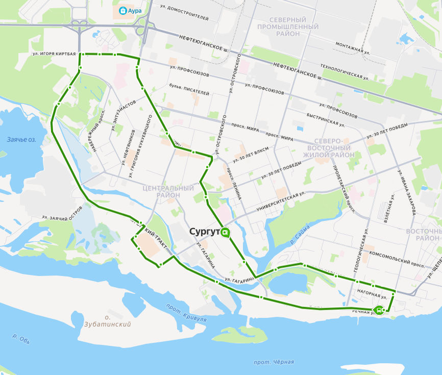 ТРЦ СИТИ-МОЛЛ → МФЦ → Многофункциональный центр &rarrПарковая; → Дворец искусств Нефтяник → Югорский тракт → ул. Игоря Киртбая → 5 А микрорайон → Нефть Приобья → Автовокзал → УБР → Кинотеатр Аврора → ул. Бахилова → Агентство воздушных сообщений → ул. Энергетиков → Университет → Горвоенкомат → Дом творчества юных → Сквер геологов → Преображенский храм → КСК Геолог → ул. Мелик-Карамова → ул. Югорская → ул. Речная → Городской пляж → Протока Бардыковка → Ледовый дворец → ТРЦ СИТИ-МОЛЛ