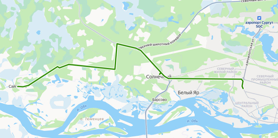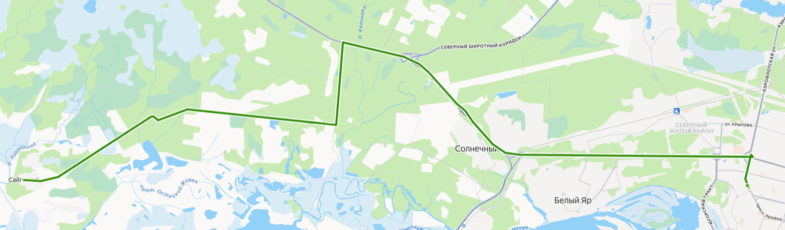 СУРГУТ, УБР → Автовокзал → ТРЦ Аура → поворот на Белый Яр → поворот на Юность → поворот на Солнечный → УТТ СН → пос. АСС ГПЗ → пос. ГПС → дер. САЙГАТИНА, ул. Центральная