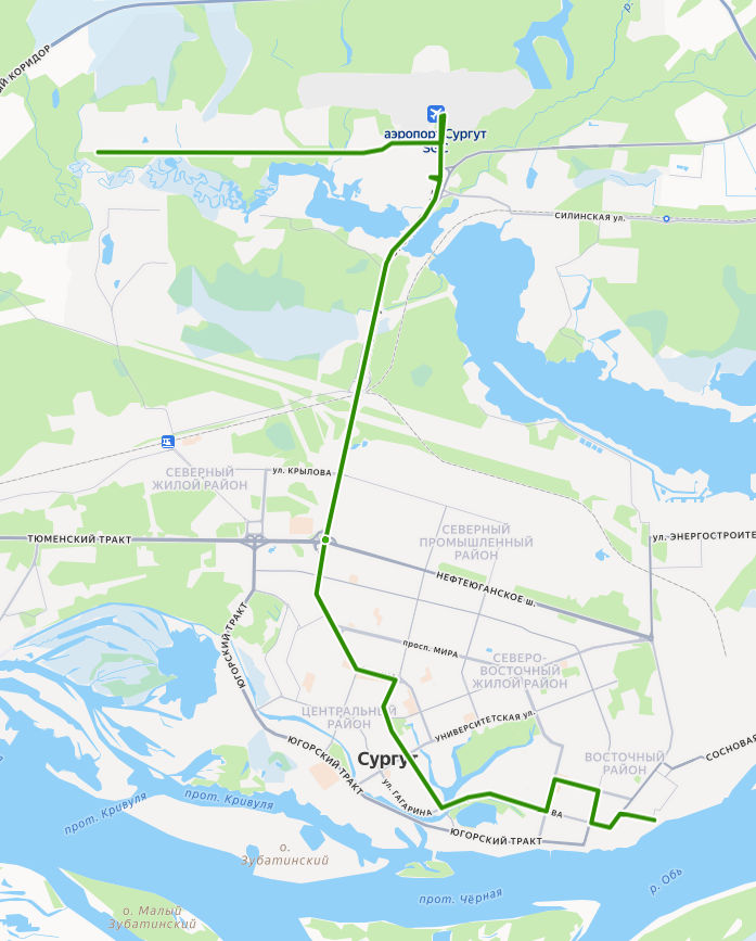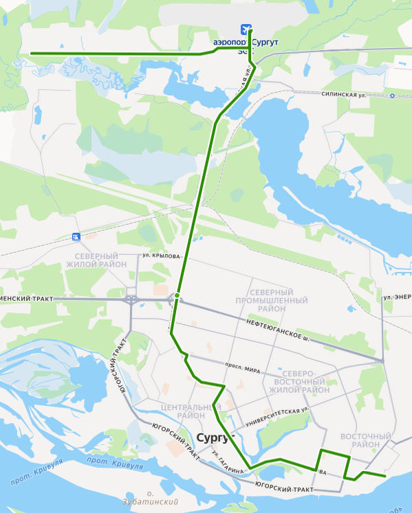 СУРГУТ, Речной вокзал → Универмаг Сургут → Рыбокомбинат → ул. Югорская → пр-т Комсомольский → Магазин Москва → ТЦ Славянский → Магазин Все для дома → Преображенский храм → Дом творчества юных → Старый Сургут → Дом Советов → Оптика → Агентство воздушных сообщений → ул. Бахилова → Кинотеатр Аврора → УБР → Автовокзал → УТТ-1 → МК-114 → 5 километр → пос. Таежный → Гостиница Полет → Аэропорт → СПК Авиатор-34 → СОТ Крылья Сургута → СНТ 35 Дзержинец → ПСОК 8 → ПК СТ 7 → ПСК 6 Геологоразведчик → СНТ 4 → СТ 3 → СНТ 2 Гвоздичка → СОТ Ручеек, ост. 1 → СОТ Ручеек, ост. 2 → ПСОК 37 Кооператор, ост. 1 → ПСОК 37 Кооператор, ост. 2 → СОТ Монтажник-40 → СПК МАГИСТРАЛЬ